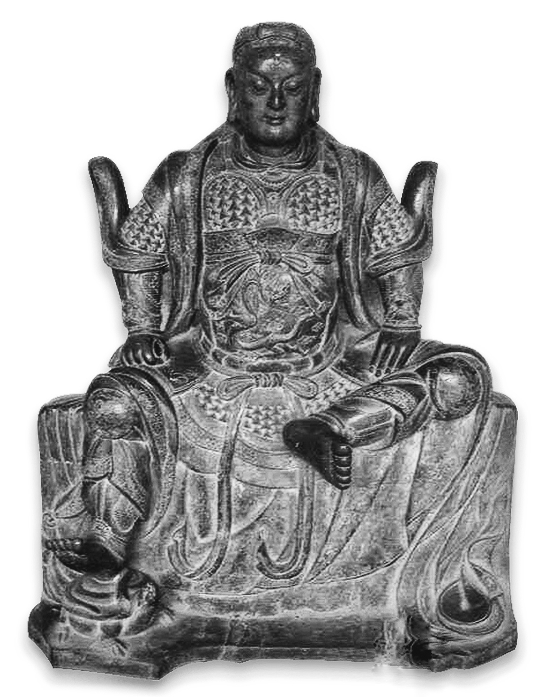 呂梁市博物館收藏陳展精品中有尊玄武大帝青銅像,該像為座像,通高154厘米,肩寬67厘米,座高60厘米,座寬130厘米。造像頭披長發(fā)至肩,束發(fā)箍,箍前飾束腰狀銀錠型發(fā)飾,面相方圓,大耳如輪,長眉鳳目,短須,發(fā)髻眉須紋絲清晰。額眉間有吉祥志和白毫。造像身著鎧甲戰(zhàn)袍,挺胸鼓肚,左腿內(nèi)曲,放于神臺之上,赤腳,右腿下垂座前,足踏玄武。左手平放于左腿上,右手持降魔劍靠右腿,坐于大抹右角的長方形座上,玄武與座連鑄,戰(zhàn)袍摞于座上,戰(zhàn)袍、鎧甲用蔓草花鎖邊,腹部與兩膝分別刻有火龍吐珠圖案,兩臂袖口用獸頭圖案裝飾?;瘕埣y獸頭紋以及鎧甲片均為浮雕,形態(tài)逼真,栩栩如生。座背部及兩側(cè)鏤空,劍身、蛇頭毀于文革時期。