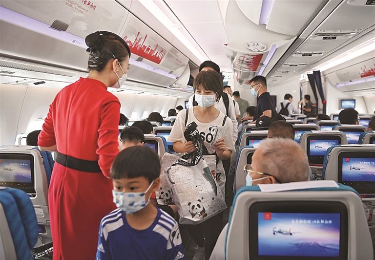 6月27日,在成都天府國際機場,搭乘四川航空公司3U8001航班的旅客陸續(xù)登機。新華社記者 王曦 攝
