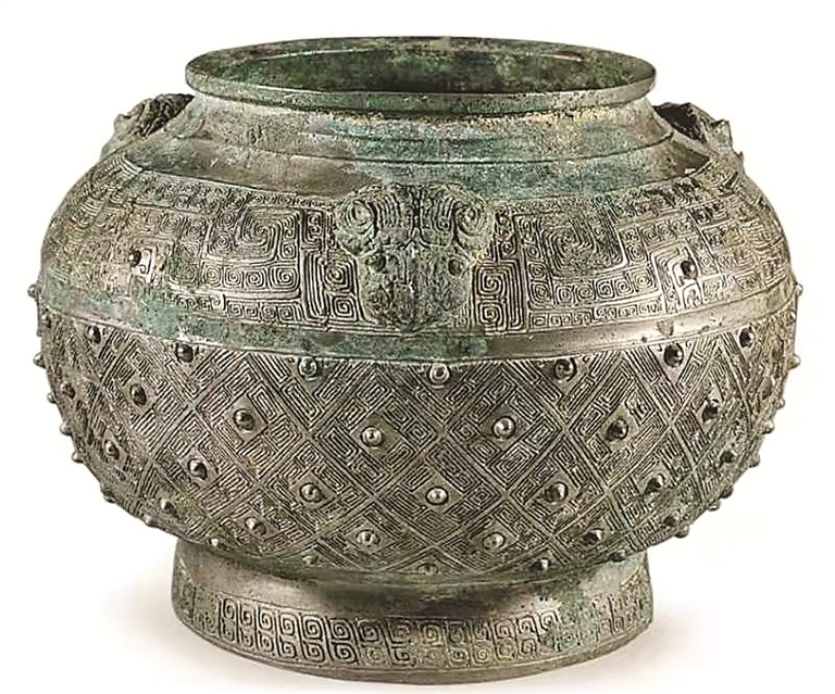 商青銅云雷地乳釘紋瓿,商代晚期盛酒器。斂口,溜肩,鼓腹,圈足。頸部飾雙弦紋,肩部高浮雕三個(gè)獸首(或羊首),肩飾目雷紋組成的夔紋,腹部飾斜方格云雷地乳釘紋,圈足飾雷紋。通體光亮如新,紋飾細(xì)膩規(guī)整。高20.5厘米,腹徑29厘米。1957年石樓縣后蘭家溝村出土,國家一級(jí)文物,現(xiàn)藏山西省博物院。