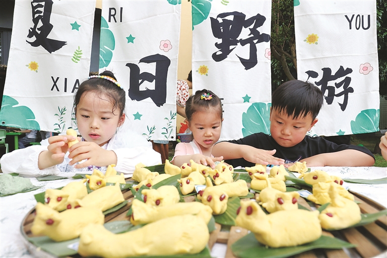 圖②:5月5日,浙江省湖州市德清縣三橋幼兒園的小朋友在捏立夏狗。