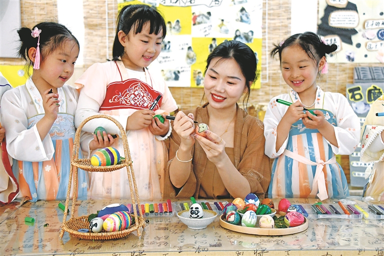 圖①:5月5日,浙江省臺州市仙居縣中心幼兒園的小朋友在老師的指導(dǎo)下繪立夏彩蛋。