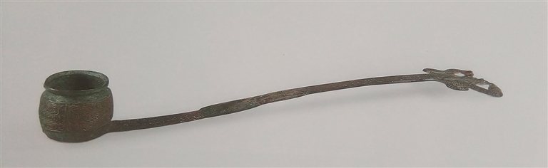 呂梁出土的青銅器生活用品有環(huán)首刀、羊首刀、鹿首刀等。此外還有很多以動物造型為設(shè)計圖案的獸首刀,以及蛙首、蛇頭做裝飾的匕、勺等,這些青銅均為素面體,只有少量的裝飾有斜方塊或者斜條紋。后蘭家溝遺址出土的一件青銅蛇首扁柄斗,屬于挹注器(把液體盛出來再注入的器具),長37cm,勺徑4.8cm,1957年出土。斗作斂口,鼓腹平底,為罐形。底部一側(cè)伸出扁平的長柄,柄首為鏤雕的二蛇戲蛙,極其生動。柄身的裝飾為云雷紋的夔龍,斗腹裝飾著云雷文的饕餮紋。