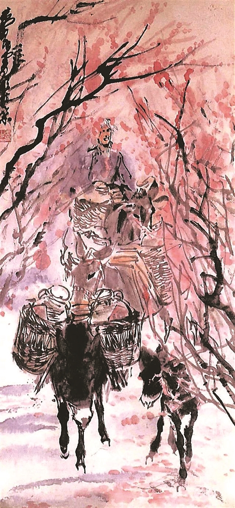 我沉思片刻,想到近年來到杏花村采風(fēng)、旅游、品美酒的畫家不少,大多以杏花、汾酒為題材寫生作畫。大約70年代左右比較有名畫家之一是黃胄先生。汾酒博物館收藏有黃胄的一幅精心之作《馱酒圖》,題材來自于生活,對送酒工的寫實(shí)畫。作品以騎驢的送酒工為畫眼,驢群馱著杏花村的美酒,穿過茂密的杏林。
