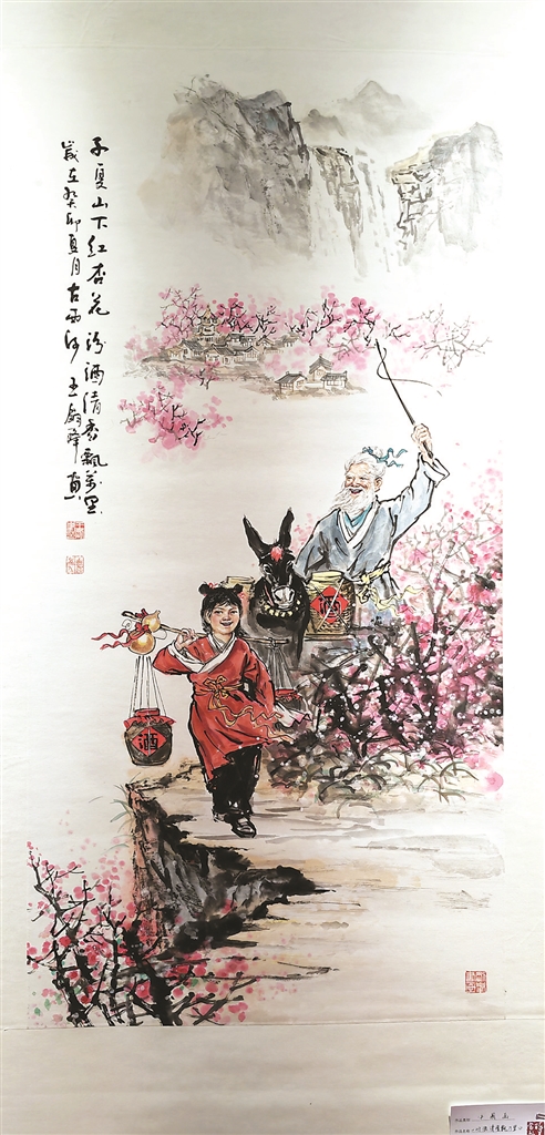 我反復(fù)觀看畫作,只見畫面構(gòu)圖布局合理,遠(yuǎn)景、近景濃淡變化自然。主景人物老人、小孩面帶淺笑,平淡地放射著沽酒后發(fā)自內(nèi)心的陽光和歡喜,也有種從容、淡定、自信自足的氣息。老人紅潤的臉色,胡須像銀絲一樣有光,一手揚(yáng)鞭,驅(qū)趕著毛驢快跑,小孫兒肩挑酒簍走在前面。配景杏花盛開粉白相間,遠(yuǎn)處的酒家依稀可見。畫中題款“子夏山下紅杏花,汾酒清香飄萬里”點(diǎn)出了畫的主題。