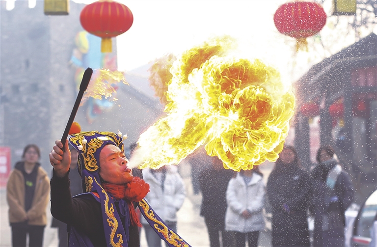 圖為2月10日,游客在山東省棗莊市鐵道游擊隊景區(qū)廟會上觀看“噴火”絕活表演。 新華社發(fā)(李志軍 攝)