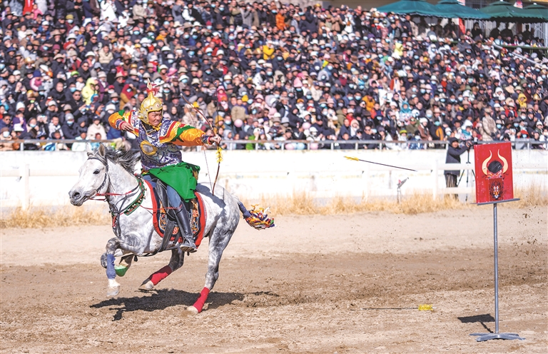 圖為2月12日,在拉薩賽馬場,騎手表演馬上射箭。 新華社記者 孫非 攝