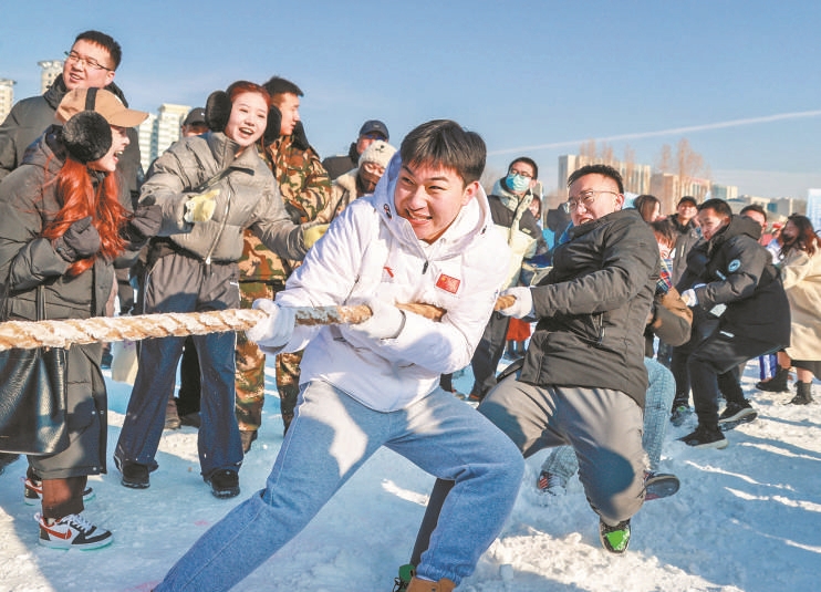 圖③內(nèi)蒙古呼和浩特,人們舉行雪地拔河比賽。