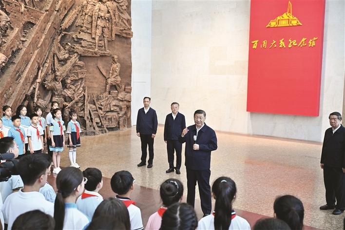 在紀(jì)念館大廳,習(xí)近平同前來參觀的青少年學(xué)生和紀(jì)念館工作人員親切交流。他說,88年前的今天發(fā)生的“七七事變”,是中華民族全面抗擊日本侵略者的起點(diǎn),前事不忘、后事之師,到這里來就是接受精神洗禮。廣大青少年生逢其時(shí),要賡續(xù)紅色血脈,樹立強(qiáng)國有我的遠(yuǎn)大志向,做堂堂正正、光榮自豪的中國人,勇?lián)褡鍙?fù)興的時(shí)代大任。