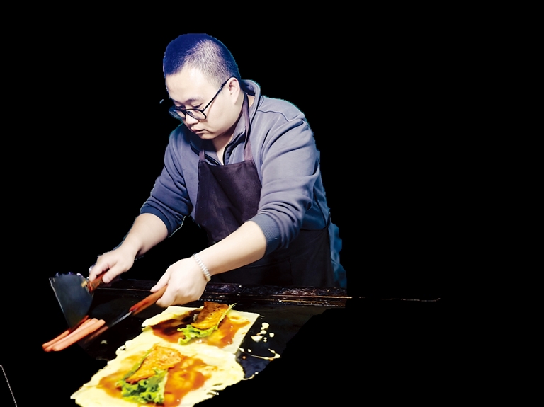 鐵板后站著攤主秦偉,三十歲,圓臉,一副黑框眼鏡后的眼神透著踏實(shí)與篤定,臉上總帶著淡淡的笑。只見(jiàn)油刷一旋,面餅一鋪,雞蛋單手磕開,“滋啦”一聲,香氣猛地炸開。刷醬、撒料、卷起、裝盒……一套動(dòng)作行云流水,不到兩分鐘,一份熱辣鮮香的烤冷面便遞到顧客手中。這方小小的煙火之地,濃縮了他八年的創(chuàng)業(yè)光陰,也見(jiàn)證了一輛三輪車到年收入三十萬(wàn)的蛻變。