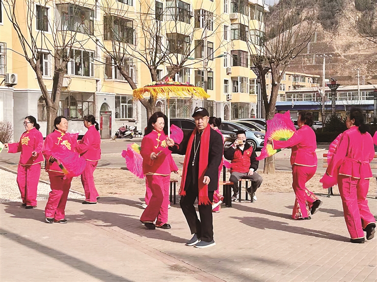 活動在鏗鏘有力的鑼鼓聲中拉開帷幕。社區(qū)文藝愛好者們換上鮮艷喜慶的服飾,手持彩扇、花傘,踏著明快的節(jié)奏翩然起舞。扭、擺、轉(zhuǎn)、跳,一招一式質(zhì)樸靈動;紅綢飛揚(yáng)、笑意盈盈,一舉一動滿含熱忱。這支由社區(qū)居民自發(fā)組成的隊(duì)伍,既有常年堅(jiān)持排練的中老年文藝骨干,也有熱愛民俗的年輕面孔,大家用最地道的石樓秧歌,傳遞團(tuán)圓喜悅,送上新春祝福。