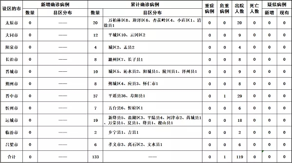 截至3月2日24時(shí),山西省11個(gè)市累計(jì)報(bào)告新型冠狀病毒感染的肺炎確診病例133例。其中: