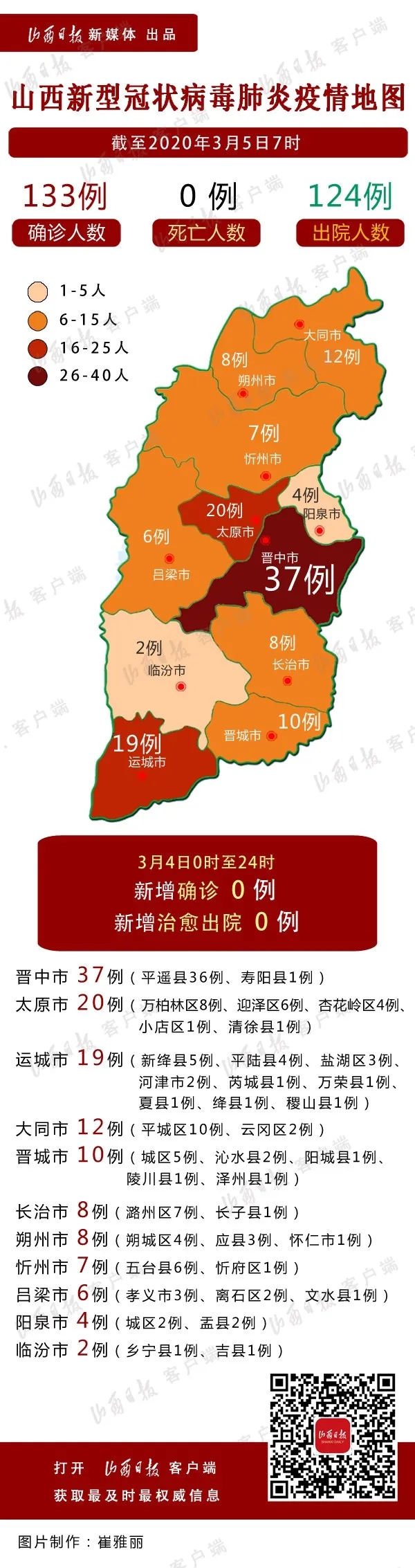 山西日?qǐng)?bào)記者秦洋報(bào)道:2020年3月4日0時(shí)至24時(shí),山西省無(wú)新增新型冠狀病毒肺炎確診病例,累計(jì)報(bào)告確診病例133例。