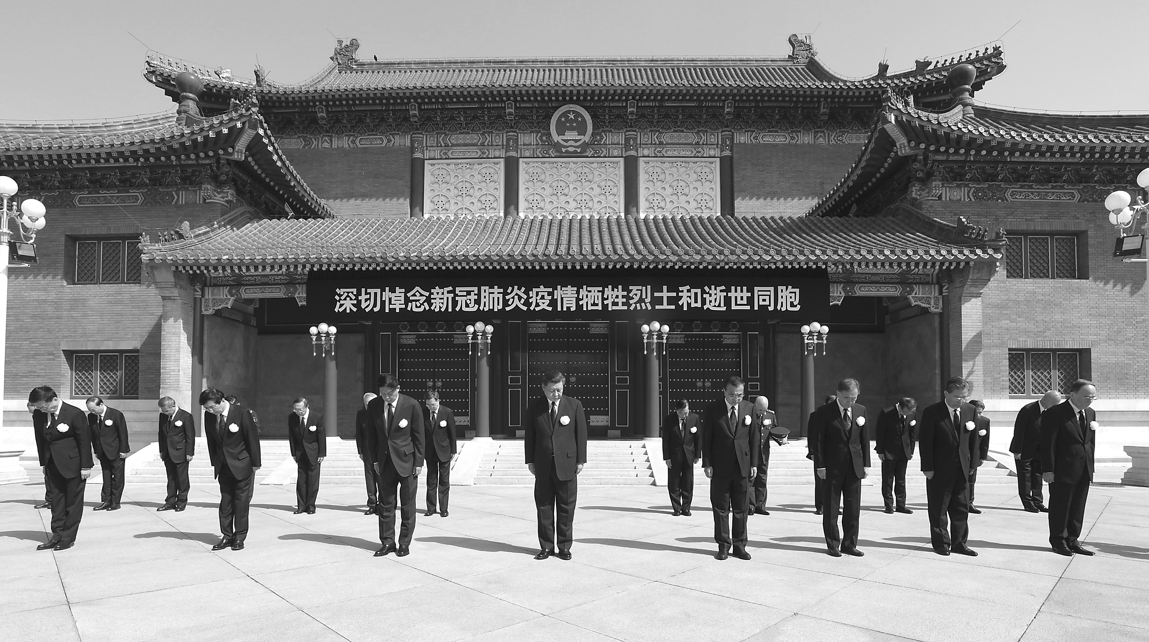 中南海懷仁堂前氣氛莊嚴(yán)肅穆,門楣上懸掛著黑底白字橫幅“深切悼念新冠肺炎疫情犧牲烈士和逝世同胞”。習(xí)近平等佩戴白花,來(lái)到這里,神情凝重面向國(guó)旗肅立。
