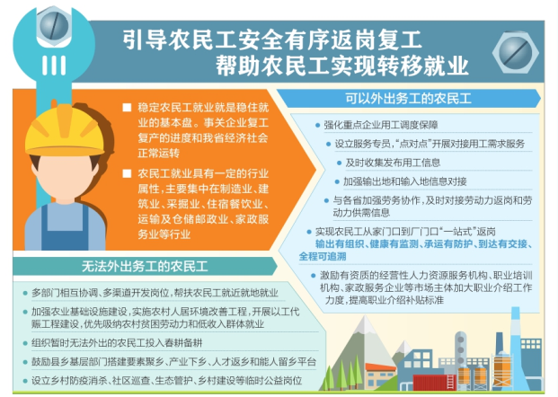 穩(wěn)定農(nóng)民工就業(yè)就是穩(wěn)住就業(yè)的基本盤。農(nóng)民工返崗之路是否暢通、就業(yè)形勢(shì)是否穩(wěn)定,不僅直接影響農(nóng)民工的工資性收入特別是貧困勞動(dòng)力增收脫貧,還事關(guān)企業(yè)復(fù)工復(fù)產(chǎn)的進(jìn)度和我省經(jīng)濟(jì)社會(huì)正常運(yùn)轉(zhuǎn)。 如何引導(dǎo)農(nóng)民工安全有序返崗復(fù)工,幫助農(nóng)民工實(shí)現(xiàn)轉(zhuǎn)移就業(yè)是疫情發(fā)生以來(lái)我省穩(wěn)就業(yè)工作和2020年決戰(zhàn)決勝脫貧攻堅(jiān)的重點(diǎn)工作之一。近日,我省發(fā)布《關(guān)于統(tǒng)籌推進(jìn)疫情防控和穩(wěn)就業(yè)工作的通知》(以下簡(jiǎn)稱《通知》),進(jìn)一步“引導(dǎo)農(nóng)民工安全有序轉(zhuǎn)移就業(yè)”。